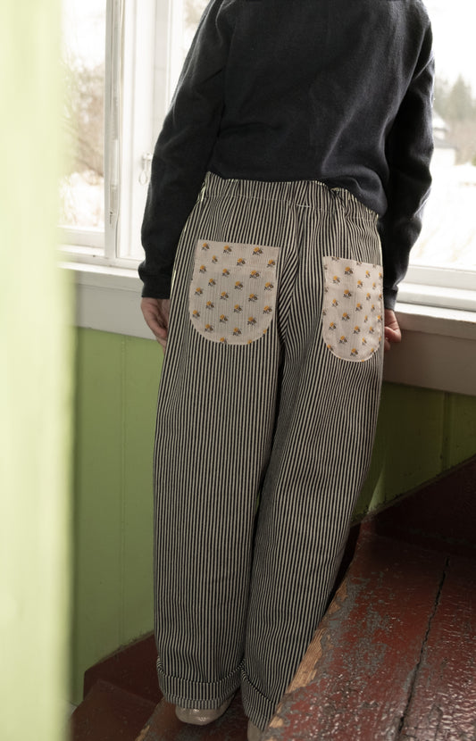 BILLE PANT, STRIPED DENIM, YELLOW FLOWER POCKETS