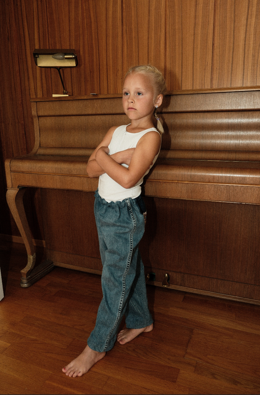 BILLE PANT, UPCYCLED LIGHT DENIM, ROSE POCKETS